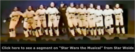 Until recently, Starslyderz 'auteur' Garrin Vincent was best known for directing and co-writing a three-hour musical production of Star Wars while a senior in the Palos Verdes Peninsula High School drama department. Part tongue-in-cheek comedy, and part unabashed geek reverence, Star Wars the Musical was the first (and best) musical theatre production of Star Wars, and would inspire many imitators. It's two performances attracted eight-hour lines and standing-room only audiences, and the musical‚s first web site drew more than a million hits across the globe (before being taken down for legal reasons). Garrin and the production were later prominently featured in the award-winning documentary feature Star Woids, as well as in segments featured on the Sci Fi Channel and in the New York Times. More importantly, the experience was a thrilling one for those involved, and many of the actors from the musical would continue to work together over the next decade.